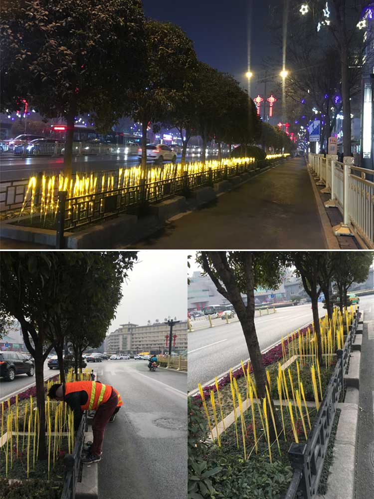 簡介—— 西安蓮湖區2019年元旦、春節亮化工程。項目包括鐘鼓樓燈光花籃雕塑,郵政廣場亮化、北大街主干道的亮化。采用了麥穗插地燈、郁金香插地燈、芙蓉花插地燈、小品燈球、串燈等多款造型燈具,共同打造出北大街沿線的夜景風光。