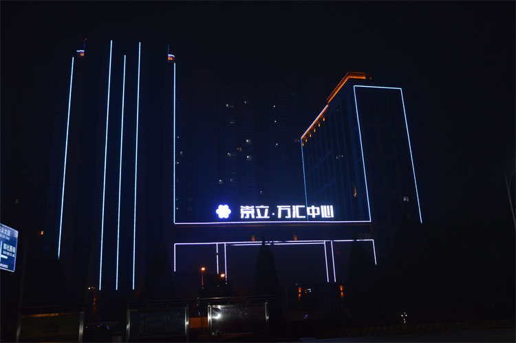 亮化樓體左側立面效果,主體采用線條燈勾勒輪廓,十字星光燈點綴測樓體