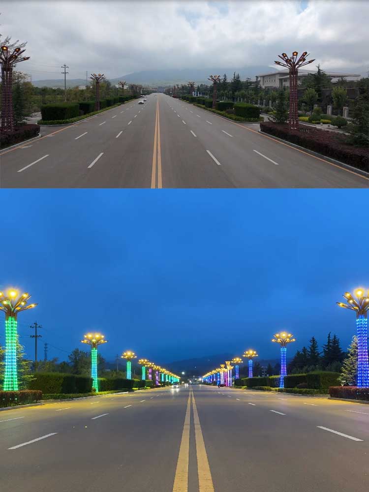 簡介—— 甘肅平涼9米景觀燈項目,安裝位于崆峒山下的市政道路倆側,主光源采用16個LED模組光源組成,配合燈體400的RGB點光源構成,系統采用512控制,夜晚整體趁現炫彩效果,亮化倆側道路。